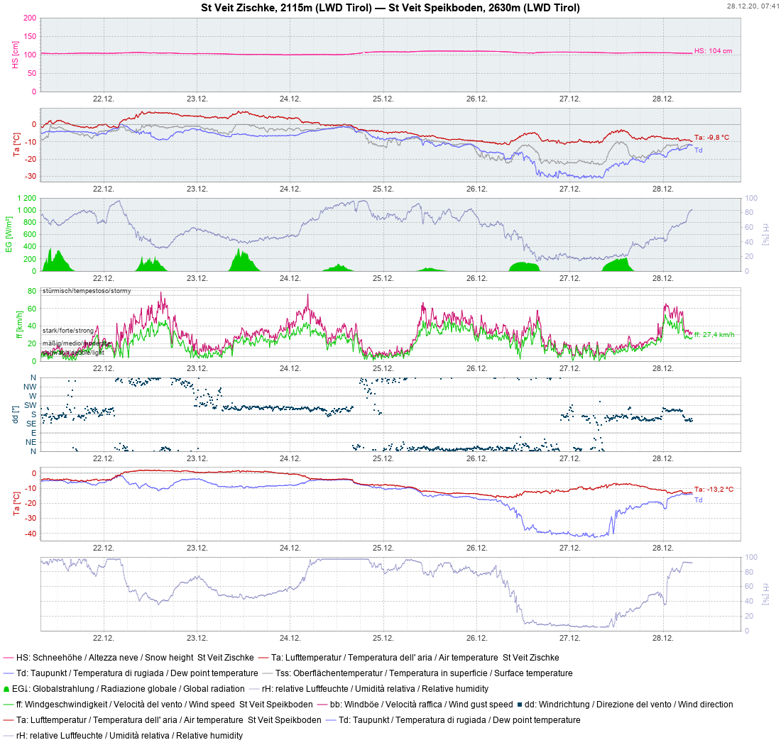 | The snowpack settled further. Frequently strong winds from varying directions, particularly on Main Alpine Ridge at high altitudes. Clearly visible: the temperature rise starting on 14.12.2020. |